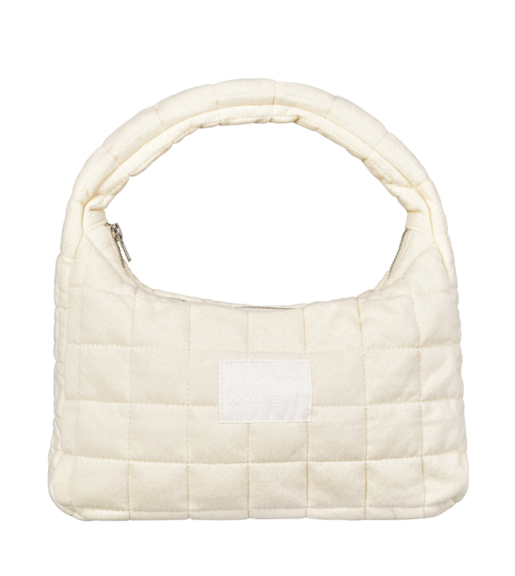 Small yellow shoulder bag made from hearts pointelle detail cotton. Gold zipper hardware. Woven logo at front. Made from 100% cotton outer and lining. 100% recycled poly padding.